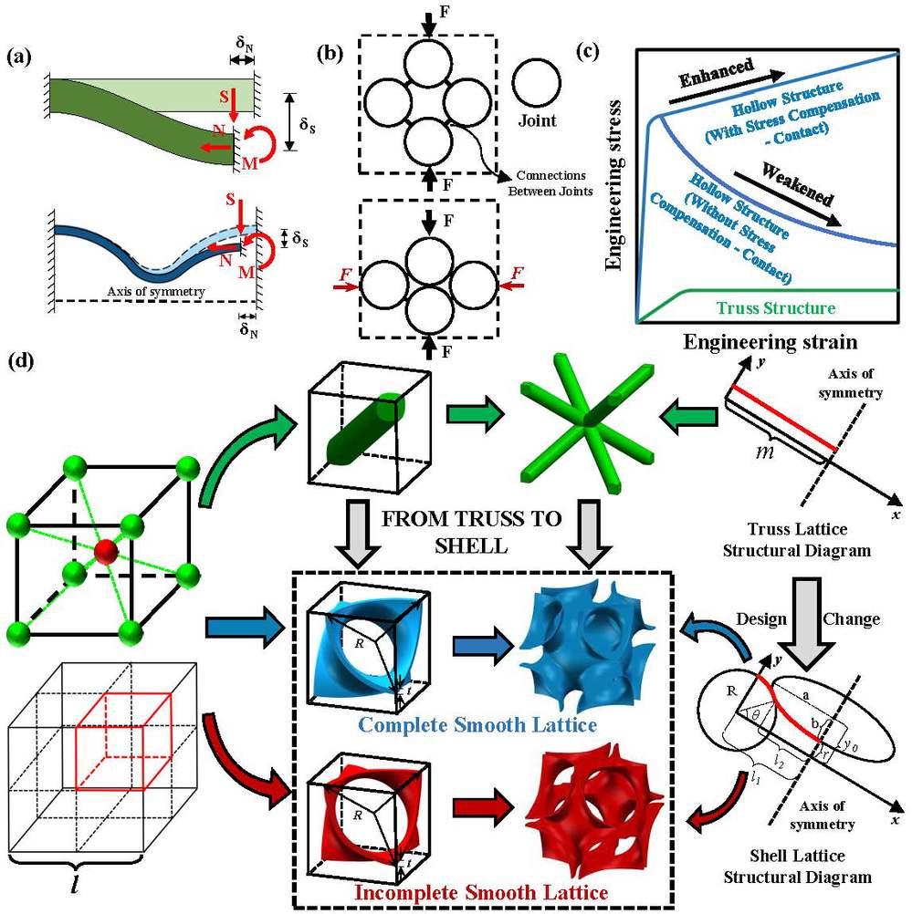 该设计基于两个关键机理:实心与壳结构在弯矩、剪力及抗屈曲性方面的显著差异,以及结构内部接触相互作用引发的应力增强效应。图1c示意了壳格单胞的主要几何参数,这些参数相互关联。为确保壳格表面光滑,需满足一组描述几何关系(旋转对称)、位置约束(节点位置)、椭圆构型(长短轴比)以及空心球‑椭圆曲线界面切线连续性的内部方程,保证各连接点处切线斜率一致: