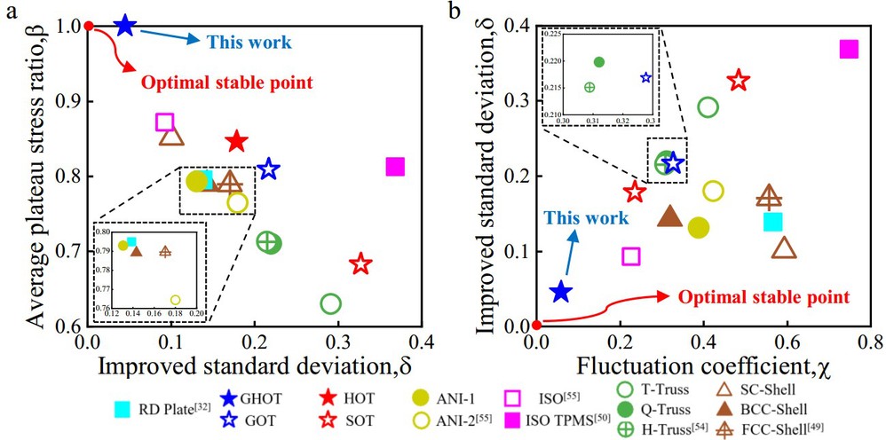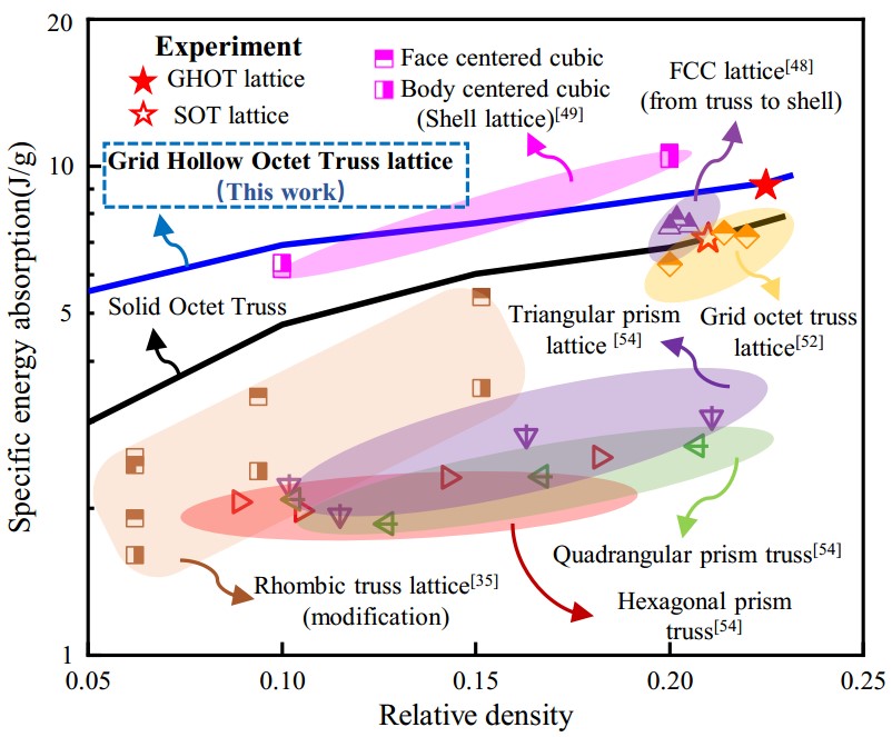 研究进一步将所提出的材料与其他优秀点阵结构进行对比,结果显示其在比能量吸收效率和屈服强度方面均表现优异。